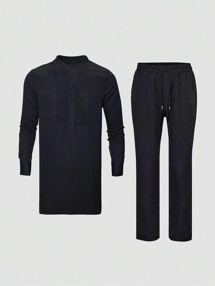Men’s Black Two-Piece Outfit – Long Sleeve Pleated Shirt & Drawstring Trousers Set