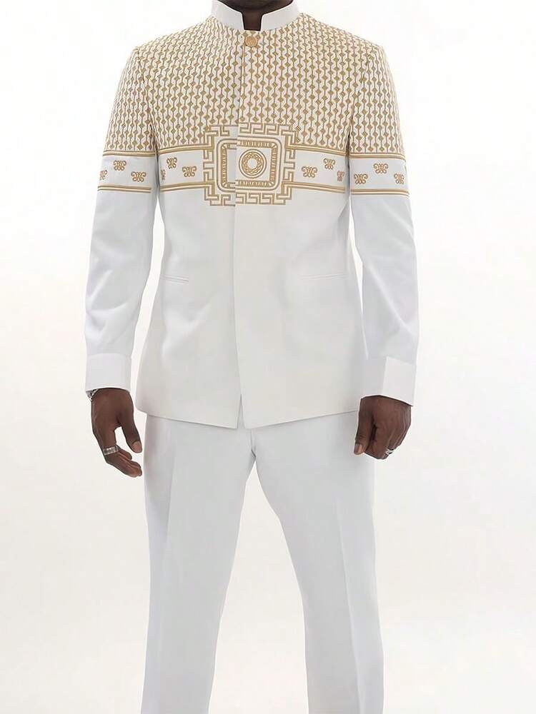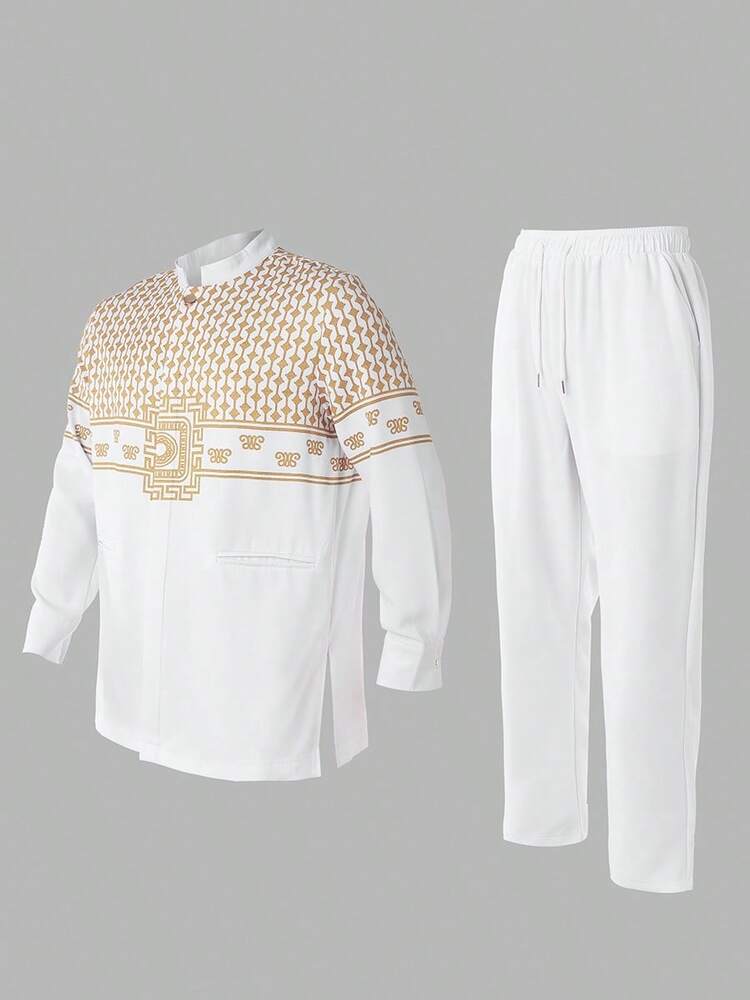 Men’s Dashiki 2-Piece Set – Colorblock Print Stand Collar Shirt & Elastic Waist Pants