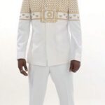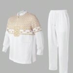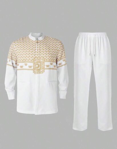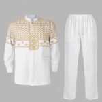 Men’s Dashiki African-inspired 2-piece set with colorblock stand collar shirt and elastic waist pants—stylish, comfortable, and perfect for events.
