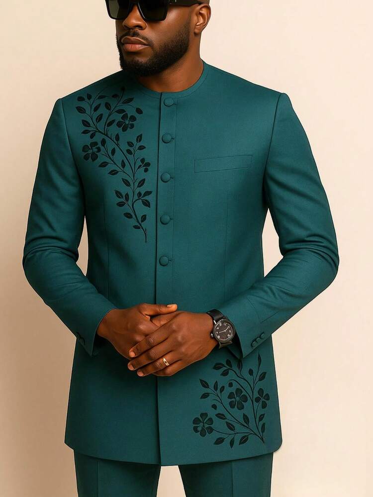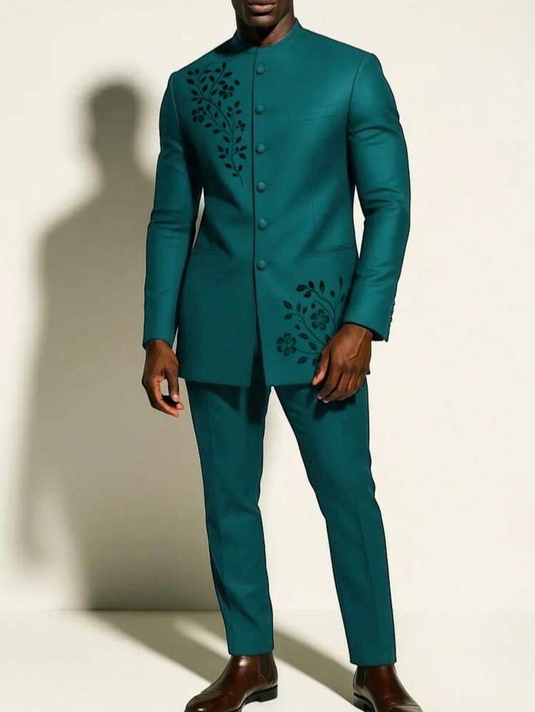 Men’s green Dashiki African-inspired 2-piece set with leaf embroidery, long sleeve shirt, and elastic waist pants—stylish and comfortable for all occasions.